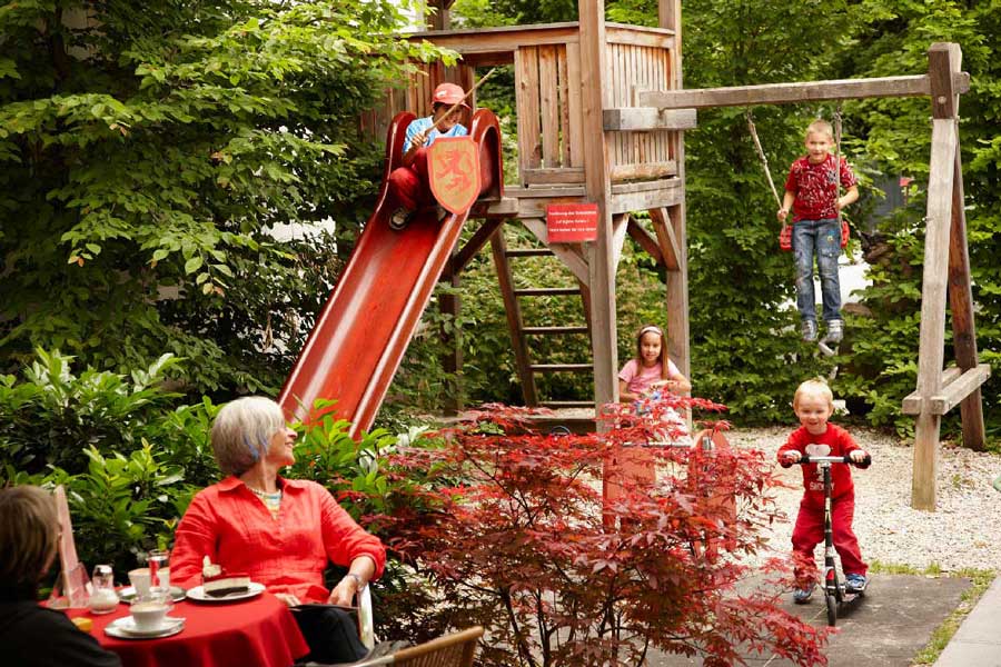 Auch für unseren kleinen Gäste haben wir was zu bieten. Beim hinteren Gastgarten ist ein kleiner Kinderspielplatz angeschlossen. Auf diesem kann der Nachwuchs den Kletterturm mit Rutsche erklimmen, Sand spielen, wippen oder in unserer Relaxliege die Seele baumeln lassen – und das Ganze natürlich immer in Sichtweite zum Gastgarten!